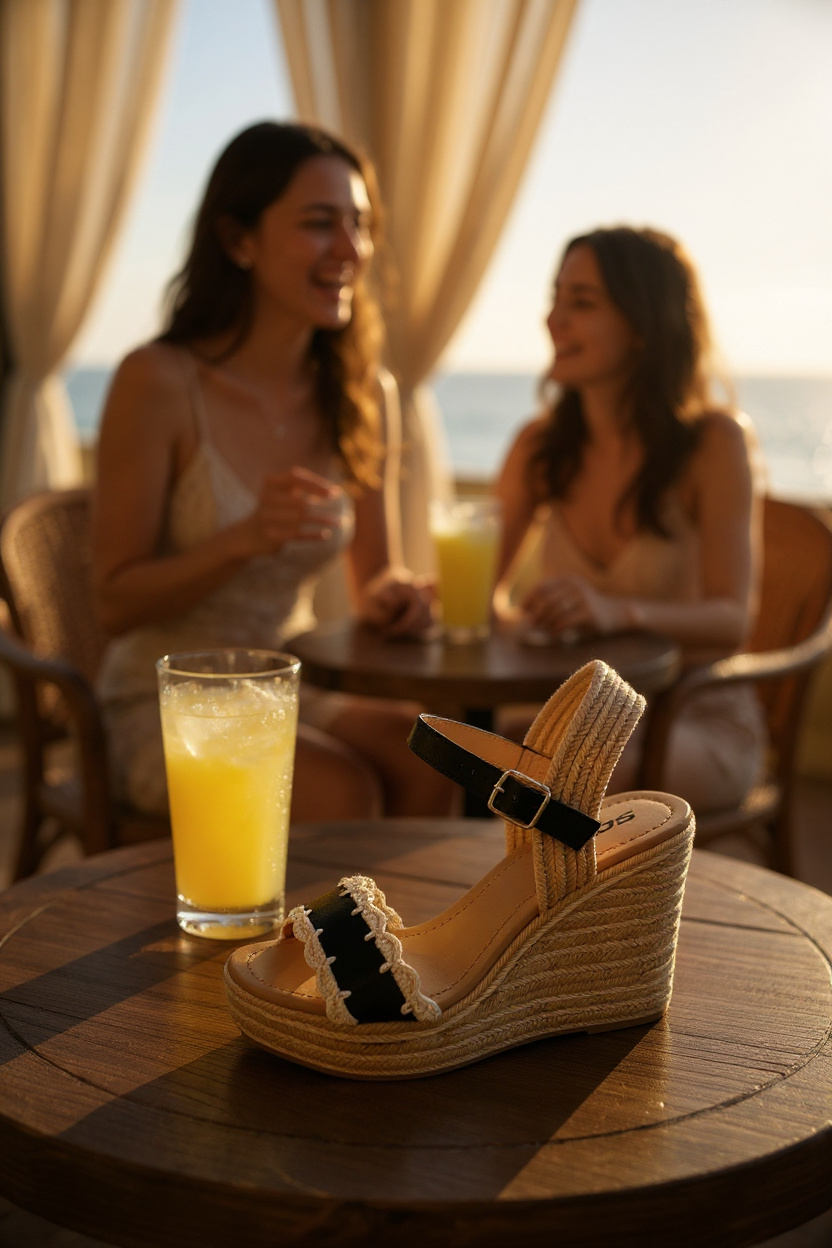Step into elegance with our Black Wedge Heeled Sandals. These sandals feature a stylish crochet detail that adds a touch of luxury to any outfit. Perfect for resort wear and summer days, these sandals provide both comfort and style. Elevate your look with these must-have wedges.